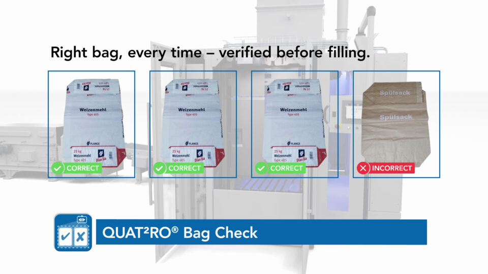 QUAT2RO® BAGcheck uses image recognition to verify that the correct bags are placed into closed, automated packing machines like the INTEGRA® IV. The system uses a camera to identify the bag before filling begins. If the system flags a bag as the incorrect type, the packing line stops to allow operators to replace it. QUAT2RO® BAGcheck provides a safeguard against product being filled into the wrong bag and potentially not being caught until palletizing or, at worst, when it reaches the customer. Like QUAT2RO® MATEXcheck, it identifies and prevents issues before they become critical.
