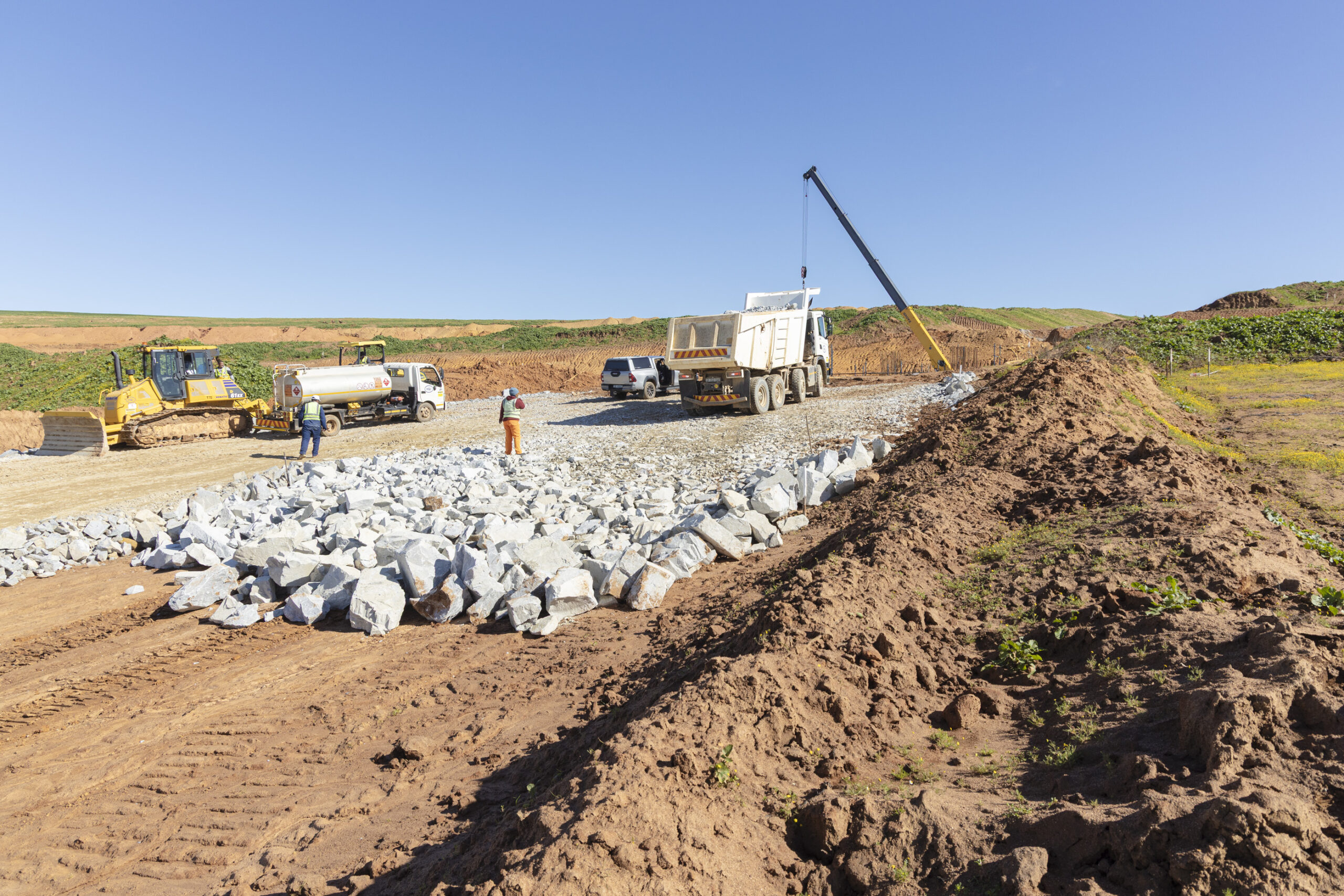 Supplied from AfriSam’s Rheebok Quarry to the H&I Malmesbury Bypass Project, a pioneer layer of rock between 500mm and 1 m deep, depending on sub-strate conditions had to be placed first.