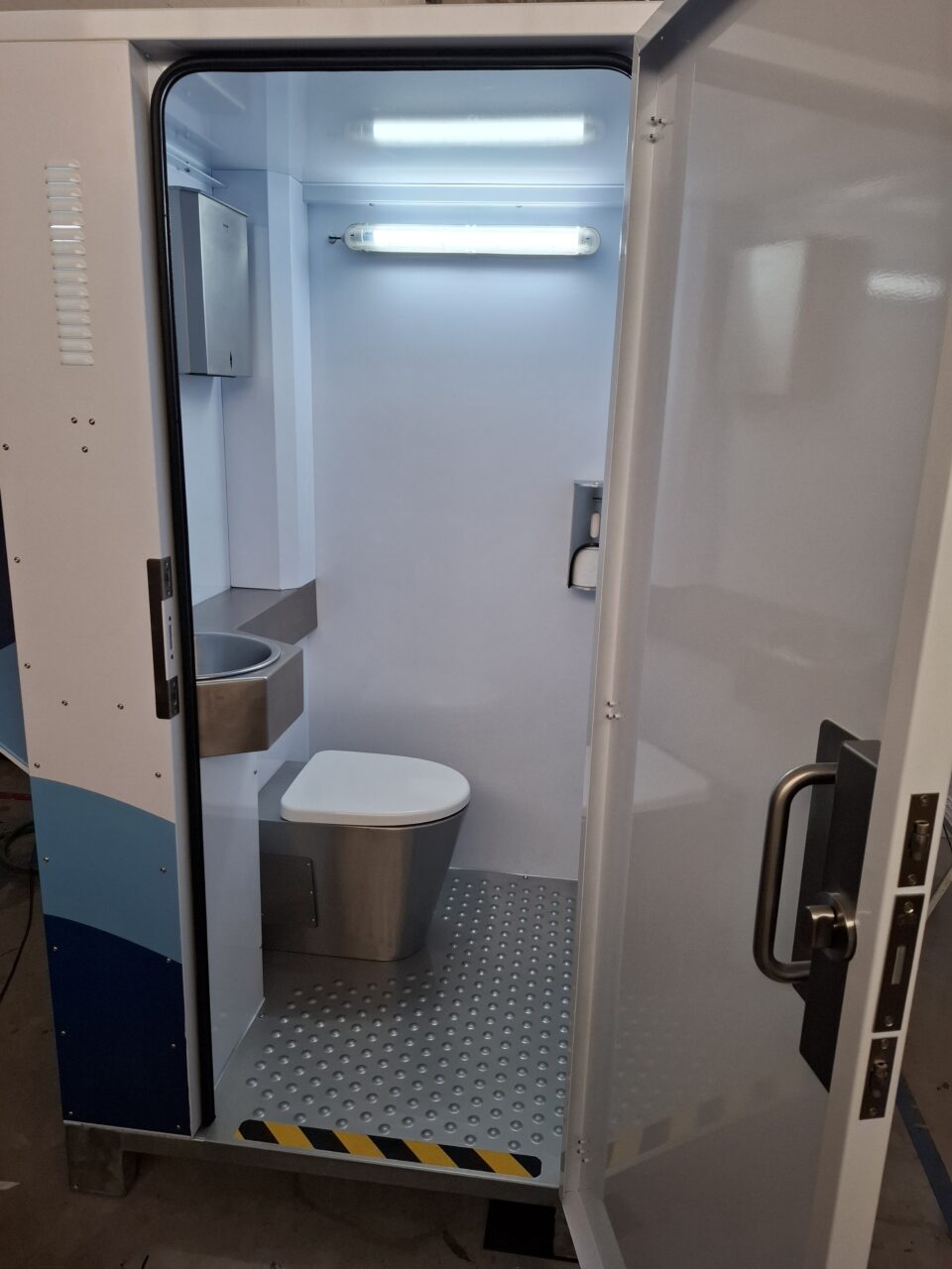 Unlike conventional holding-tank systems, the new unit integrates a compact wastewater treatment process within a single cubicle. This allows waste to be treated where it is generated, significantly reducing the need for manual handling and transport.
